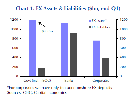 Da der chinesische Staat, Banken und Unternehmen alle positive Nettovermögenspositionen in Fremdwährungen halten, werden sie alle von einem schwächeren Renminbi profitieren, zumindest aus bilanzieller Sicht. Natürlich ist die Relation Fremdwährungsvermögen zu Fremdwährungsverbindlichkeiten nicht bei allen Unternehmen gleich verteilt, so dass einige in Schieflage geraten können. Angesichts der Fähigkeit des Staates, den Banken und Unternehmen im Bedarfsfall Devisen zuzuführen, sollten die Gewinne die Verluste auf Makroebene überwiegen.