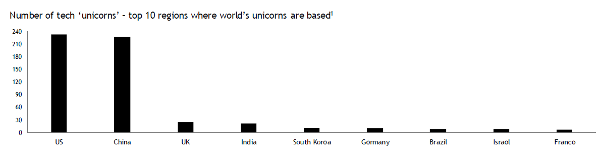 China hat seit geraumer Zeit erkannt, dass hohes und nachhaltiges Wirtschaftswachstum in einer moderenen Volkswirtschaft langfristig nur über Innovationen und Forschung geleistet werden kann. Die nachfolgende Grafik zeigt die weltweite Verteilung von „Einhörnern“ (englisch: Unicorns), also neu gegründeten Unternehmen (start-ups) mit einer Marktbewertung von mehr als 1 Milliarde US Dollar.