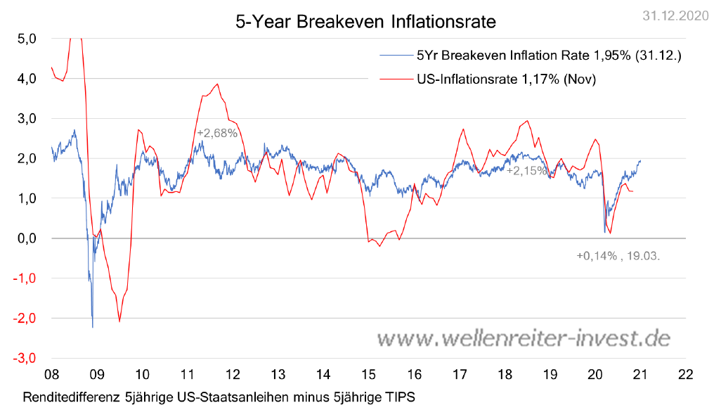 Der Hauptgrund für diese Entwicklung liegt in der jüngst deutlich gestiegenen Inflationserwartung. Die Hoffnung, dass umfassende Impferfolge dem Coronavirus alsbald den Garaus machen und somit das Wirtschaftsleben mormalisieren, dürfte preistreibend wirken. Der nachfolgende Chart illustriert die 5-Jahres Breakeven Inflationsrate (blau = Renditedifferenz 5-jährige US-Staatsanleihen minus 5-jährige inflationsgesicherte US-Staatsanleihen, TIPS) und die Entwicklung der US-Inflation (rot). Folgt die tatsächliche Inflationsrate der Erwartung wie in der Vergangenheit, dann dürfte die Teuerungsrate im Mai 2021 bei mindestens 2% liegen.