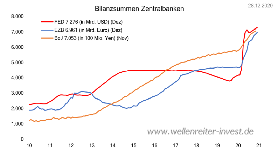 Zur Bekämpfung der wirtschaftlichen Folgen der Corona-Pandemie senkte die amerikanische Notenbank Fed den Leitzins im März 2020 auf 0 -0,25% und weitete in den folgenden Monaten durch massive Wertpapierkäufe die Notenbankbilanzsumme auf rund 7,3 Billionen Dollar deutlich aus.