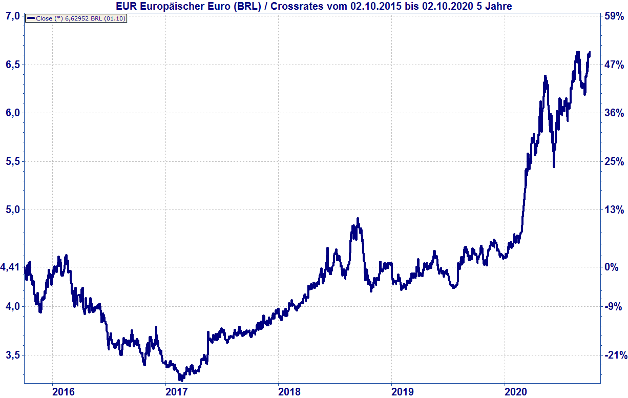 Seit dem Jahresende 2019 hat der Real zum Euro um 47 Prozent abgewertet. Wir sehen dies in Teilen als eine Übertreibung, die sich in den kommenden Monaten wieder etwas korrigieren wird. Die aktuellen Konjunkturdaten aus Brasilien signalisieren eine Schrumpfung der Wirtschaft in 2020 um etwa 5%. Dies ist deutlich weniger als bei anderen Schwellenländern. Das Land profitiert in besonderem Maße von der starken Wirtschaftserholung in China. Die Chinesen betreiben die Ankurbelung ihrer Ökonomie, nach dem Corona-Lockdown, sehr stark über Infrastrukturprojekte. Hierfür bedurfte und bedarf es hoher Importe von Rohstoffen. Davon profitiert das rohstoffreiche Brasilien in besonderem Maße.
