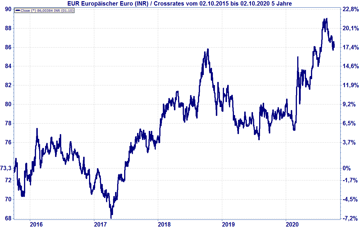 Auch die Indische Rupie notierte jüngst gegenüber dem Euro auf einem 5-Jahres-Tief. Allerdings konnte sich die INR seither um etwa 3,5% erholen. Weitere 10% Gegenbewegung (weitere Erholung) erscheinen uns denkbar.