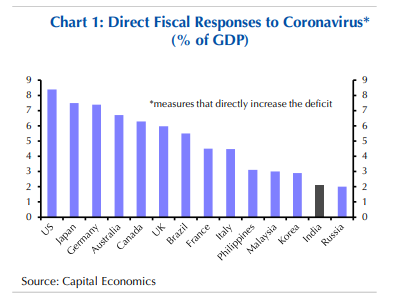Indien hat, zumindest bisher, nicht das ganz große Füllhorn an monetärer und fiskalischer Unterstützung ausgeschüttet, wie der nachfolgende internationale Vergleich zeigt.