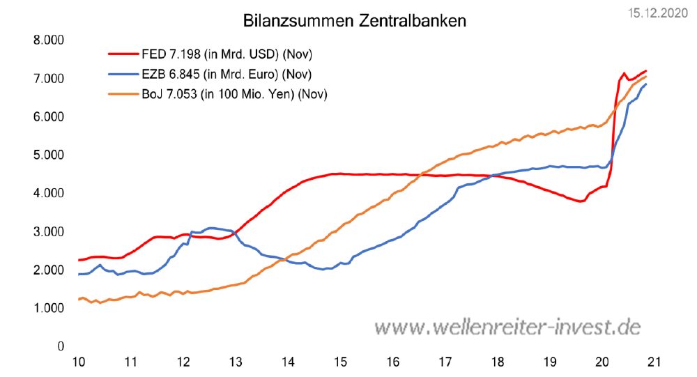 Die nachfolgende Grafik illustriert die enorme Zunahme der Bilanzsummen, durch umfangreiche Wertpapierkaufprogramme, am Beispiel der amerikanischen (Fed), europäischen (EZB) und japanischen (BoJ) Notenbank.
