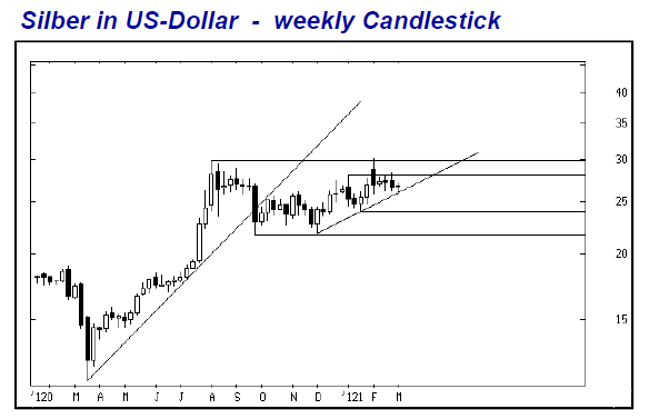 Auch beim Silber dauert die Konsolidierung seit dem Hoch im Sommer 2020 jetzt schon lange Monate an. Nach dem Test des Langfristwiderstandes bei 29,86 Dollar Ende Januar versetzte erst das anschließende False-Breakout am wichtigen Vorgängerhoch bei 27,93 Dollar das Silber wieder in den Korrekturmodus. Einer voll ausgefahrenen neuen Abwärtsamplitude steht derzeit allerdings noch der mittelfristige Aufwärtstrend seit Ende November im Weg. Dieser Trend verläuft in dieser Woche bei 26,00 Dollar. Gerade gestern und heute wurde er erstmals erreicht und bis zur Stunde gehalten. Das hält die Bullen zunächst weiter im Spiel. Erst wenn dieser Aufwärtstrend fällt, läuft die neue Abwärtsamplitude noch einmal voll an mit einem worst-case Ziel von 21,66 Dollar je Unze.