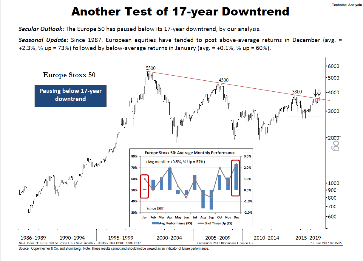 Bleibt die spannende Frage, ob dieses positive Szenario bereits in den Börsenkursen vollständig eingepreist ist? Mir stach diese Woche der nachfolgende Chart des Euro Stoxx 50 Index aus der Feder der Markttechniker unseres US-Brokers Oppenheim & Co. ins Auge. Bis zum Top-Stand des Index Anfang des Jahres 2000 bei 5.500 Punkten sind es per heute immerhin rund 55% Potential.