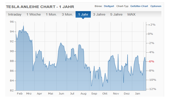 Auch der Finanzmarkt sieht die finanzielle Stabilität von Tesla mittlerweile kritisch. Die USD-Anleihe mit einem Kupon von 5,3% und einer Laufzeit von 6,5 Jahren notiert nur noch bei 88% und bietet fast 8 Prozent Rendite (siehe nachfolgende Grafik) . Ein nicht unbedeutendes Zahlungsausfallrisiko ist also eingepreist.